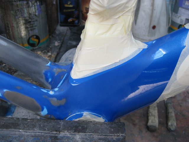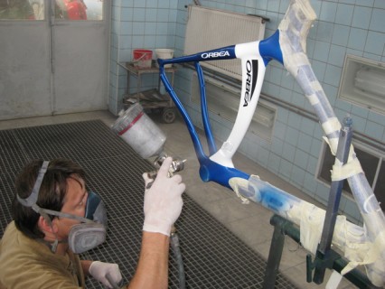 Na zadní vzpěře máme nalepenou maskovací samolepu, přes kterou vystříkáme bílý nápis ORBEA.
