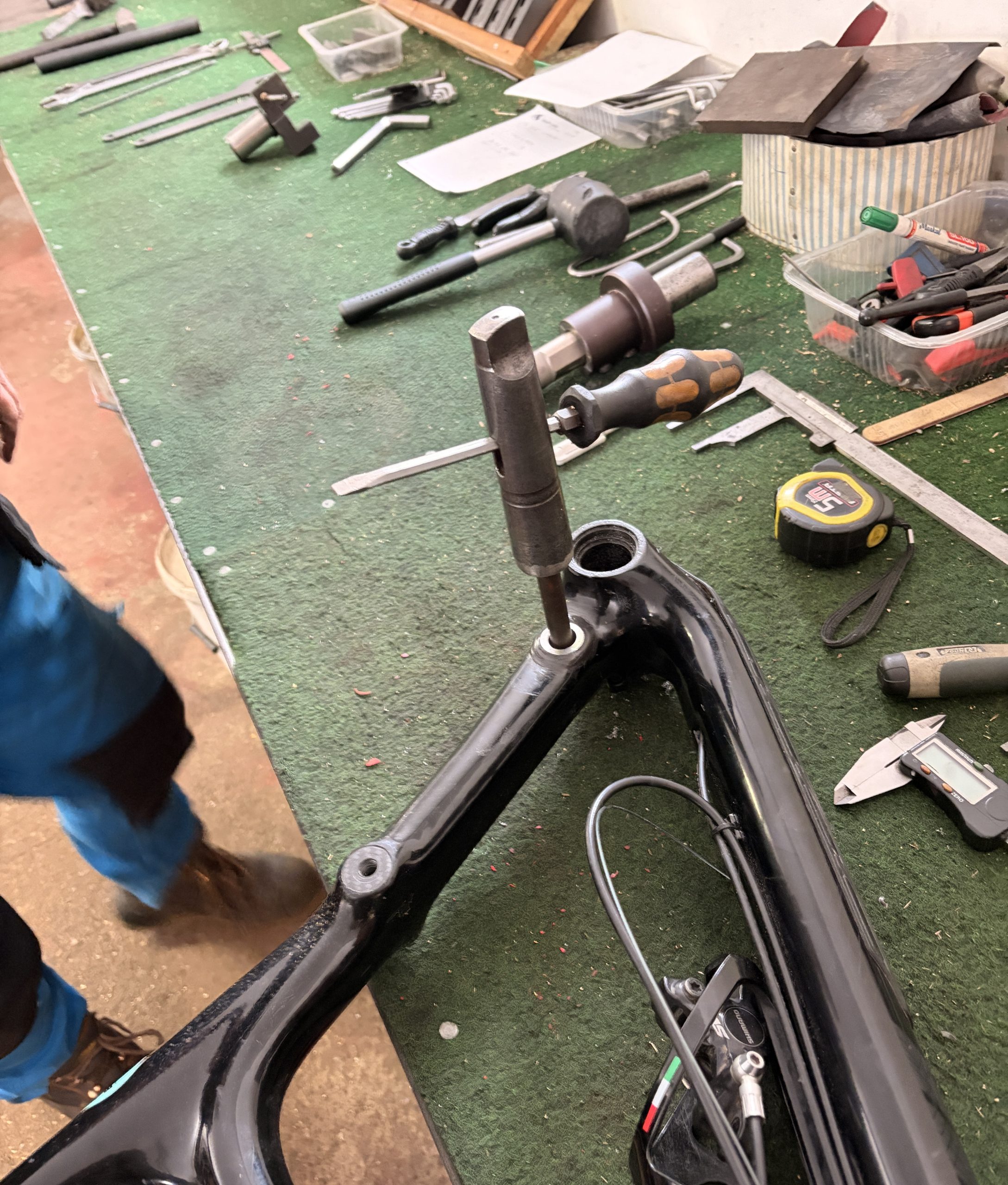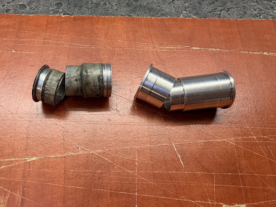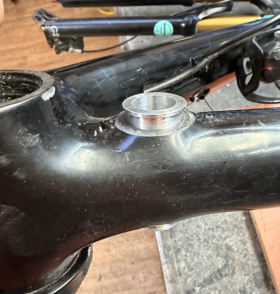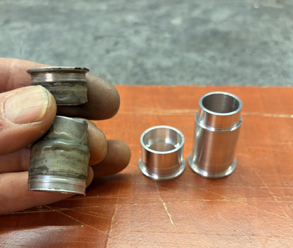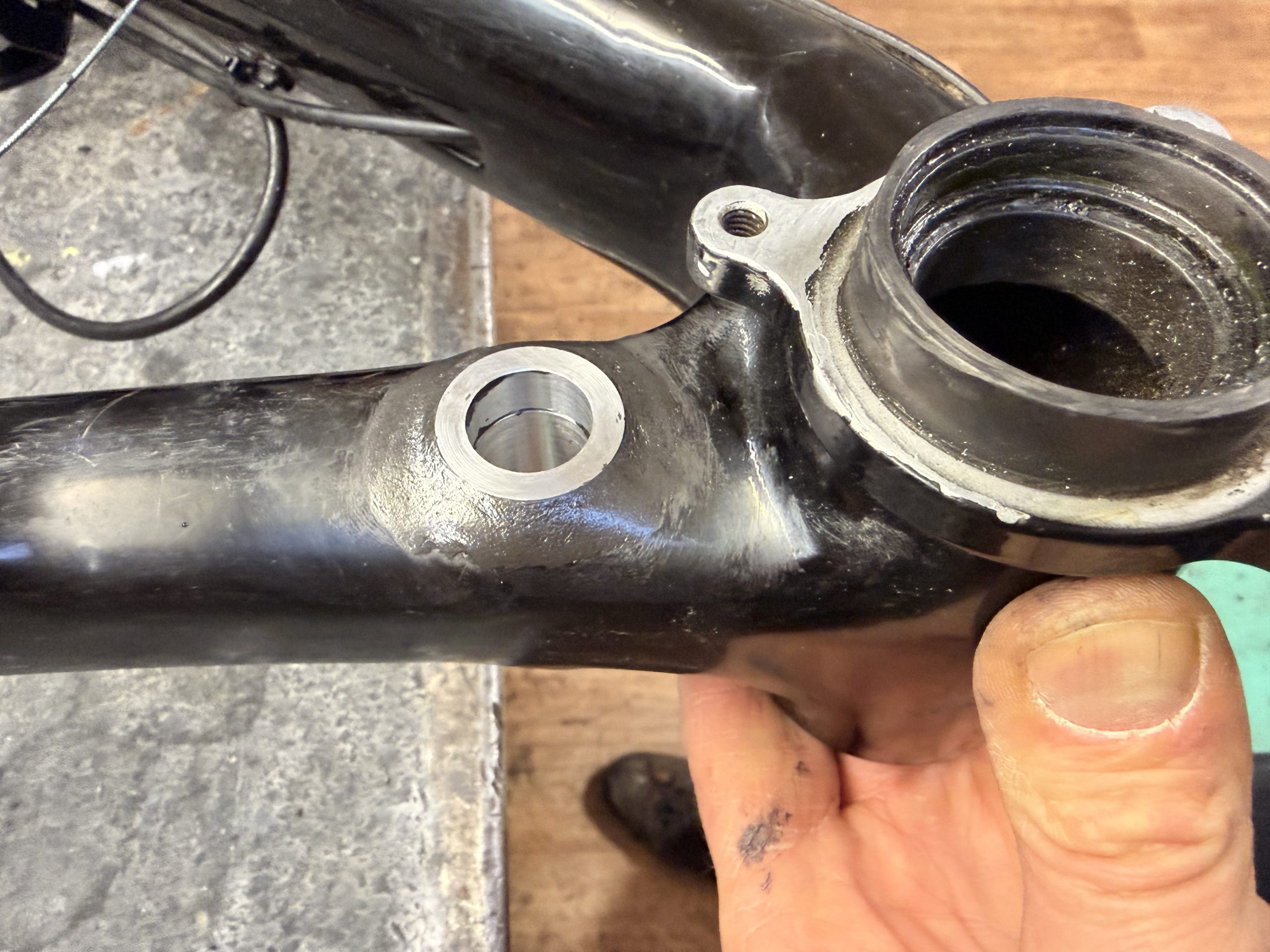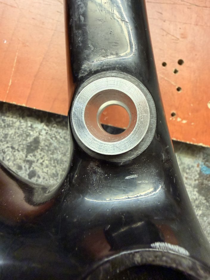Pak už je to hračka. Změříte si díry v rámu na obou stranách (ta vykotlaná je větší), uděláte výkres a vytočíte si nové větší pouzdro na soustruhu.